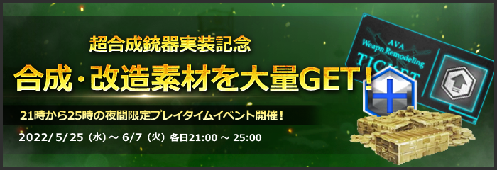 「超合成銃器」の実装を記念してプレイ時間に応じて銃器の合成や改造に必要な素材や、ゲーム内通貨(ユーロ)を大量獲得できるイベントを開催しております。開催期間中、毎日21時から25時の間に対象ミッションを指定プレイすることで最大70枚の「銃器改造チケット」や、280万の高額ユーロなどを入手することが可能です。