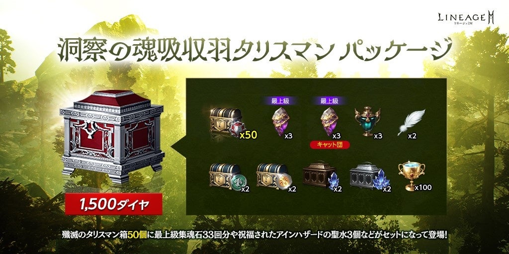 「殲滅のタリスマン箱(刻印)」50個や、「殲滅の最上級集魂石II(11回)(刻印)」3個、「殲滅の最上級キャット団集魂石(11回)(刻印)」3個、「殲滅の祝福の羽(刻印)」2個などがセットになった「洞察の魂吸収羽タリスマン パッケージ」が登場しました。