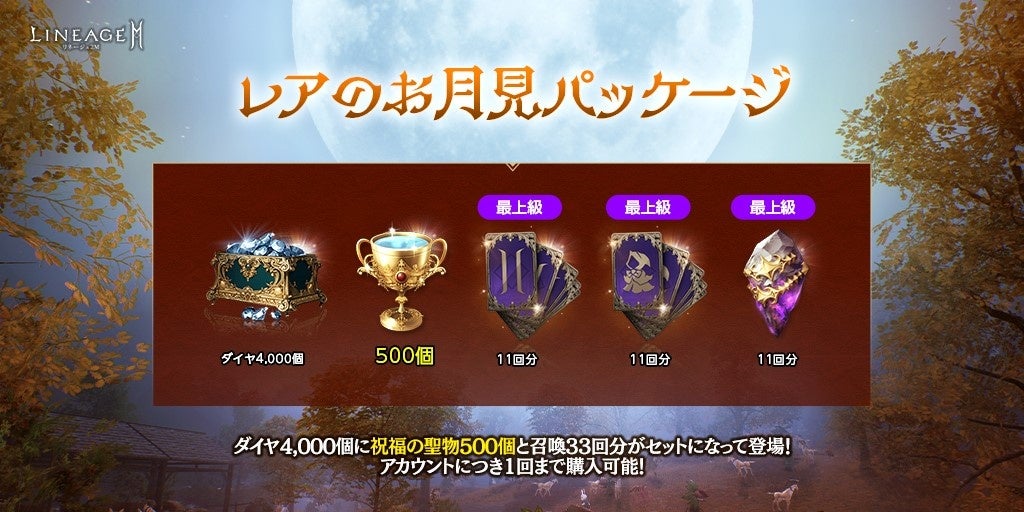 ダイヤ4,000個と、「殲滅の最上級クラス獲得券(11回)(刻印)」1個、「殲滅の最上級アガシオン獲得券(11回)(刻印)」1個、「殲滅の最上級集魂石II(11回)(刻印)」1個、「祝福の聖物」500個がセットになった「レアのお月見パッケージ」が登場しました。