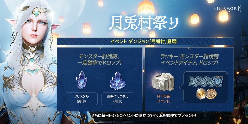 「月下の箱(イベント)」は使用することで「啓示の証」のほかに各種「希少級製作図の欠片(刻印)」や「祝福の印章(刻印)」を一定確率で獲得できる可能性があります。また、期間中、毎日9時にゲーム内郵便にて「月兎村の時間補充石(イベント)」や「アインハザードの祝福」1,500などのイベントや冒険に役立つアイテムをお送りします。イベントの詳細は公式サイトのお知らせをご確認ください。