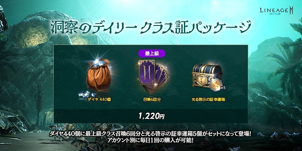 ダイヤ440個と、「殲滅の最上級クラス獲得券(6回)(刻印)」1個、「光る啓示の証幸運箱(刻印)」5個がセットになった「洞察のデイリー クラス証パッケージ」が登場しました。