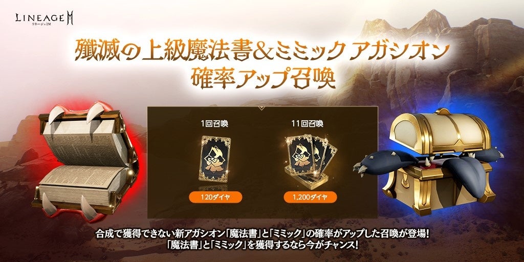 新規英雄級アガシオン「魔法書」、新規希少級アガシオン「ミミック」の登場を記念して、「魔法書」「ミミック」の召喚確率がアップする、「殲滅の上級魔法書&ミミック アガシオン確率アップ召喚」が登場しました。