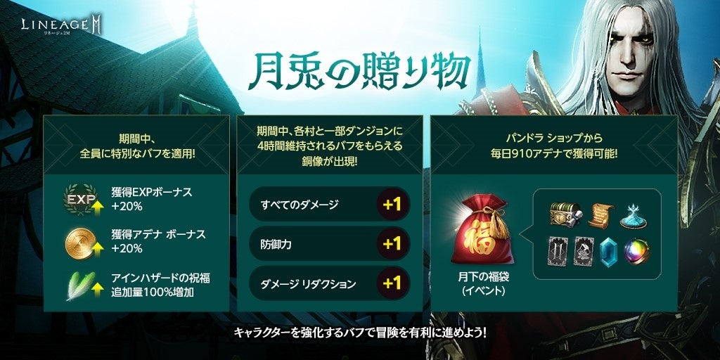 また、ショップでは、期間中1日1回、910アデナを使用することで「月下の福袋(イベント)」を獲得することができます。