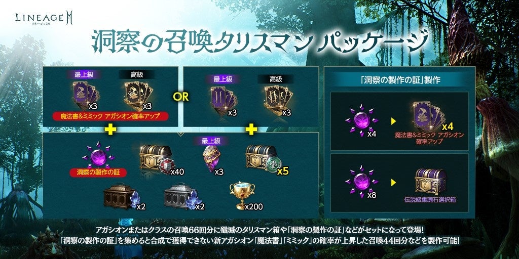 「殲滅のタリスマン箱(刻印)」40個に、クラスまたは魔法書&ミミック アガシオン確率アップの召喚66回分、「殲滅の最上級集魂石II(11回)(刻印)」3個、「洞察の製作の証(刻印)」1個などがセットになった「洞察の召喚タリスマン パッケージ」が登場しました。
