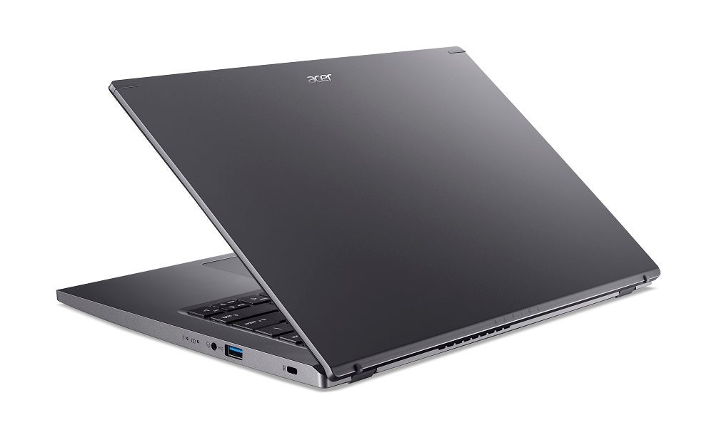 ボディは落ち着いた色合いのスチールグレイカラーに仕上げ、コンパクトな筐体は約1,490gと持ち運びも可能です。カバー上部にシルバーカラーのAcerロゴをあしらいました。ディスプレイを囲むベゼルを狭く設計し、スクリーン対ボディ比は81.18%を実現。スタイリッシュかつ画面に集中できるデザインを採用しています。