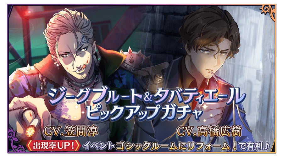 好評開催中のイベント「ゴシックルームにリフォーム!」の攻略に役立つ「ジーグブルート(CV:笠間淳)」と「タバティエール(CV:高橋広樹)」の特攻カード、★3「【独り、非道を往く末】ジーグブルート」と★3「【失意の雨】タバティエール」が登場する、期間限定のピックアップガチャを開催いたします!