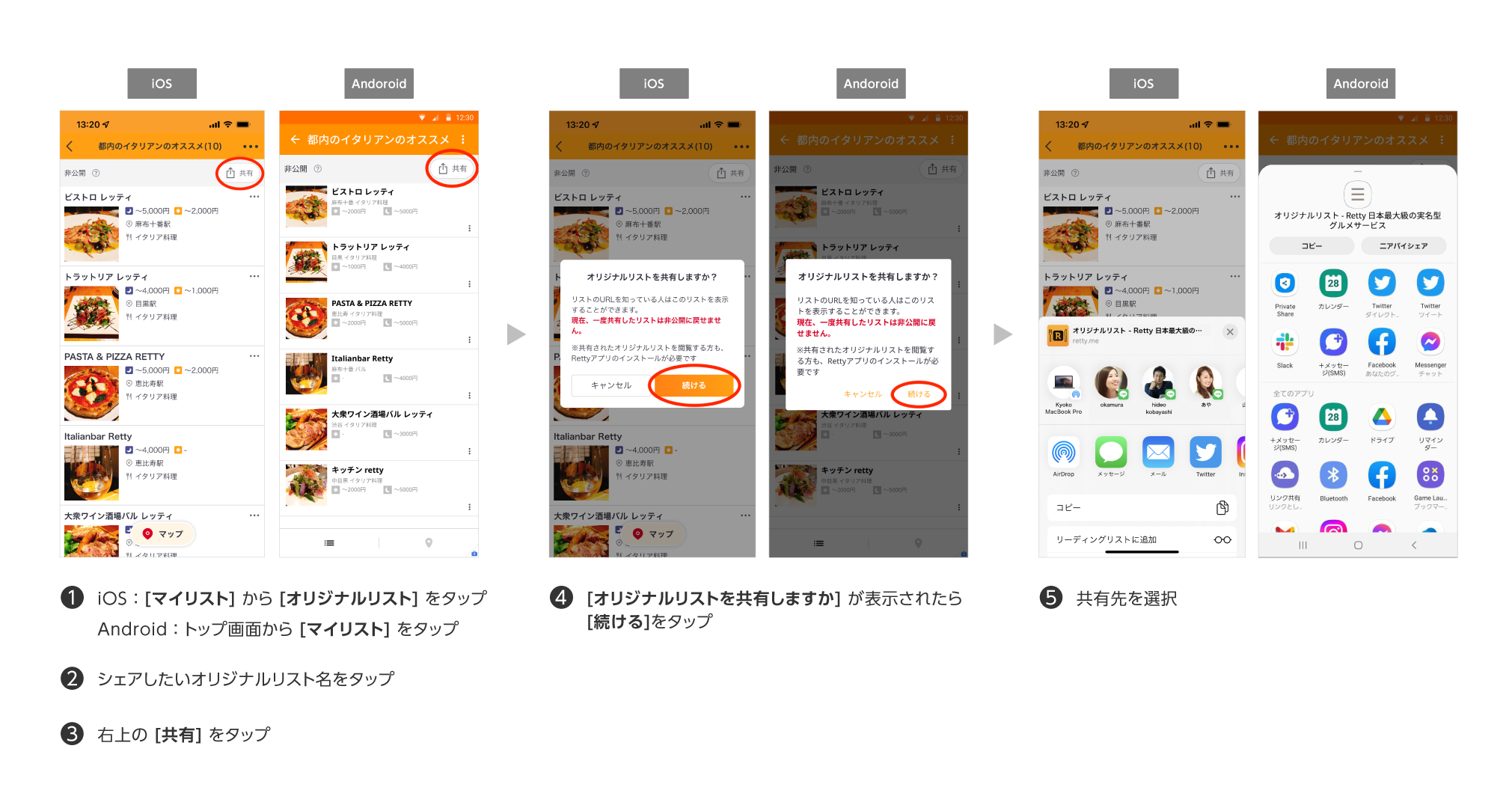 オリジナルリストの共有はオススメのお店や気になっているお店を一覧にして、誰かに教えることのできる機能です。これまでRettyではオリジナルリストをつくることはできましたが、本人が閲覧するためのもので共有することはできませんでした。多くのユーザーさんから共有機能の熱いご要望があり、本日リリースにいたりました。