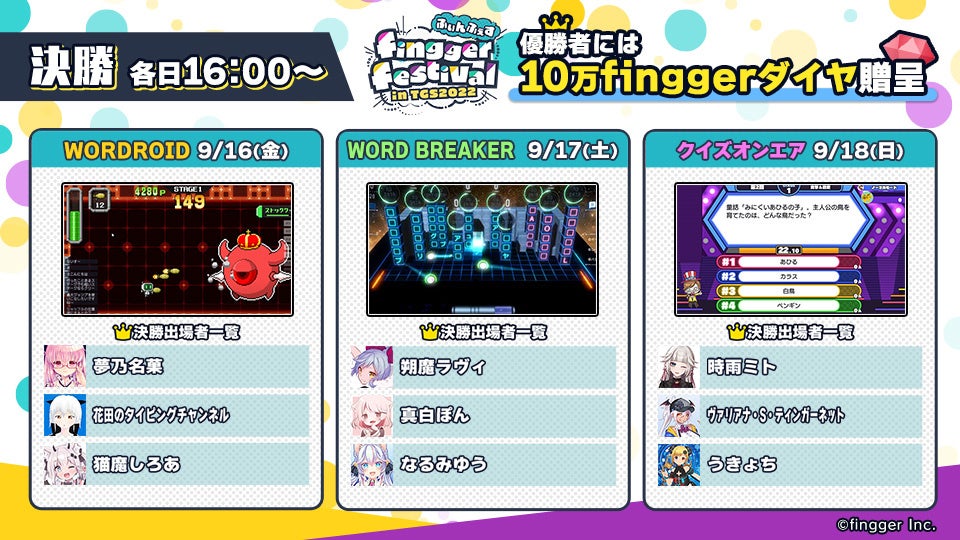 東京ゲームショウ2022会場に足を運ぶ方はもちろん、finggerやfingger公式YouTubeチャンネルでの配信も予定しておりますので、ご自宅からもぜひご視聴・ご参加ください。