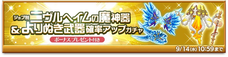 期間中、「ジョブ別 ニヴルヘイムの魔神器&よりぬき武器確率アップガチャ」を販売します。