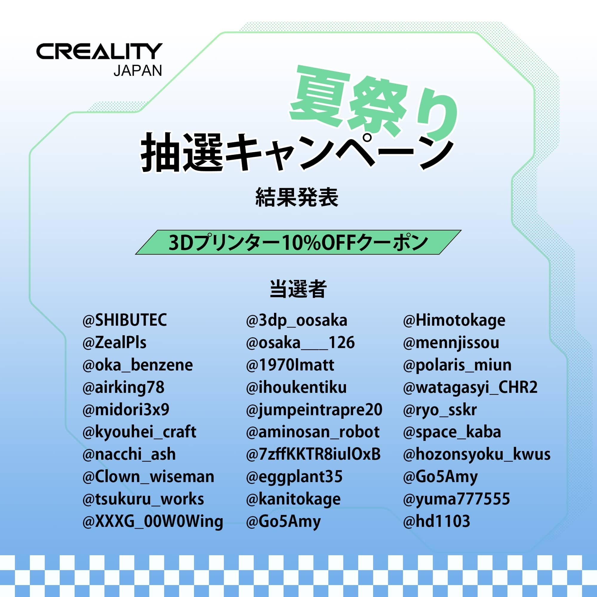 3Dプリンター10%OFFクーポンの当選者のようになります。