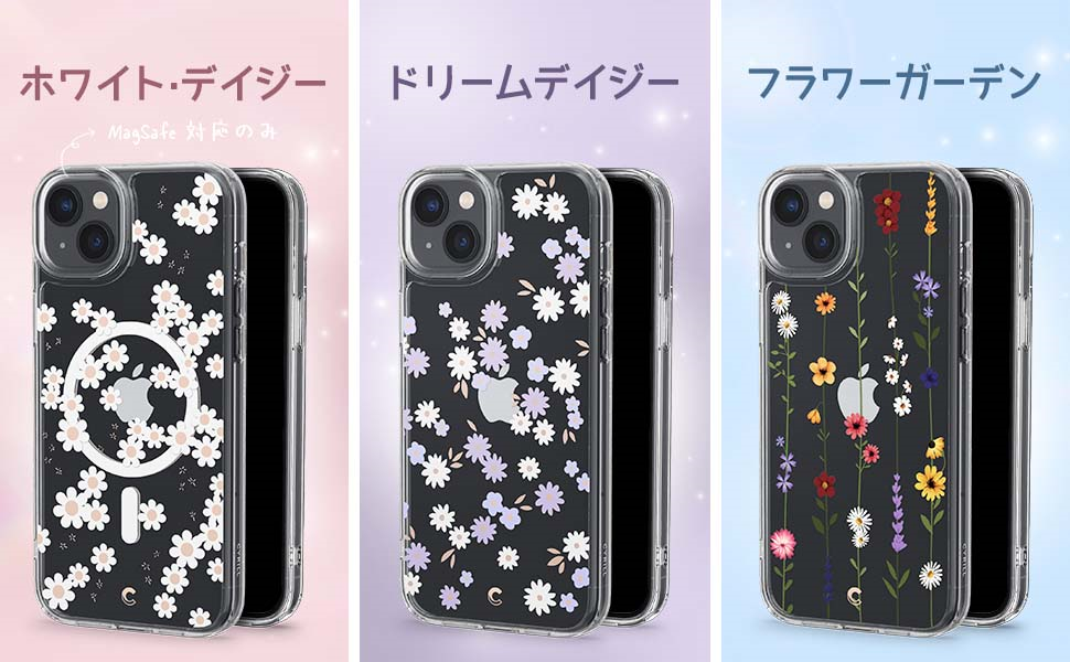 さわやかなフラワーパターンの、美しい女性とよりよく似合う花柄パターンケースです。クラシックな花柄のクリアケースです。スマホ本来の色を見せながら5月の香りを感じたい方にオススメ。 CYRILLならではのデザイン保護技術により、柄のディテールがより長く楽しめます。 ホワイトデージマックケース限定でマックセーフに互換でき、Magsafe充電時魔法のような着脱·無線充電機能を提供します。