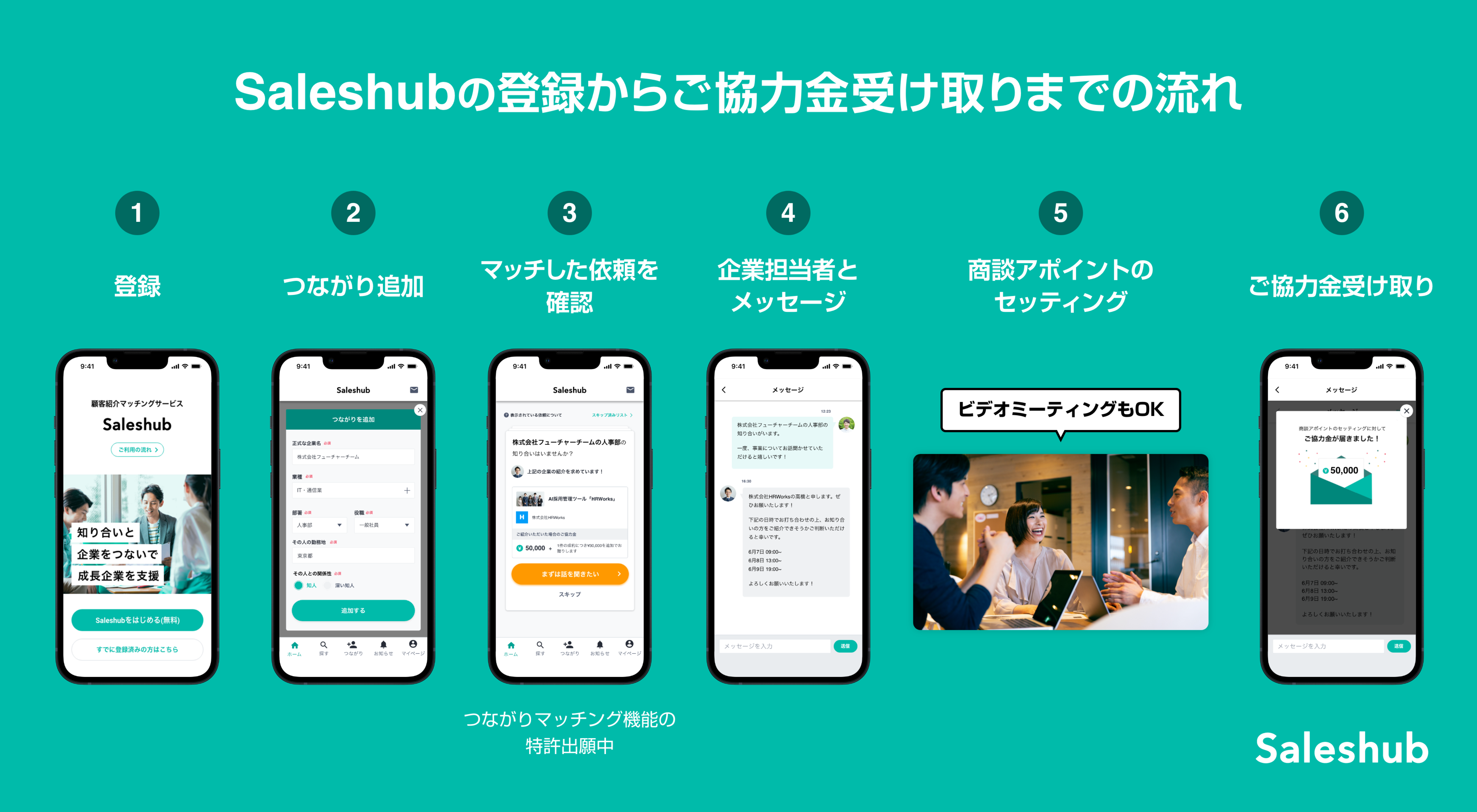 Saleshubは、商談アポイントのセッティングによって成長企業を支援する顧客紹介マッチングサービスです。掲載企業は社外の方(サポーター)から紹介による商談アポイントをセッティングしてもらうことができ、サポーターは自身の知り合いと企業との商談をセッティングすることで報酬を獲得できます。これまでに30,000人以上が登録し、上場企業から話題のスタートアップまで累計3,000社以上の企業が利用しています。