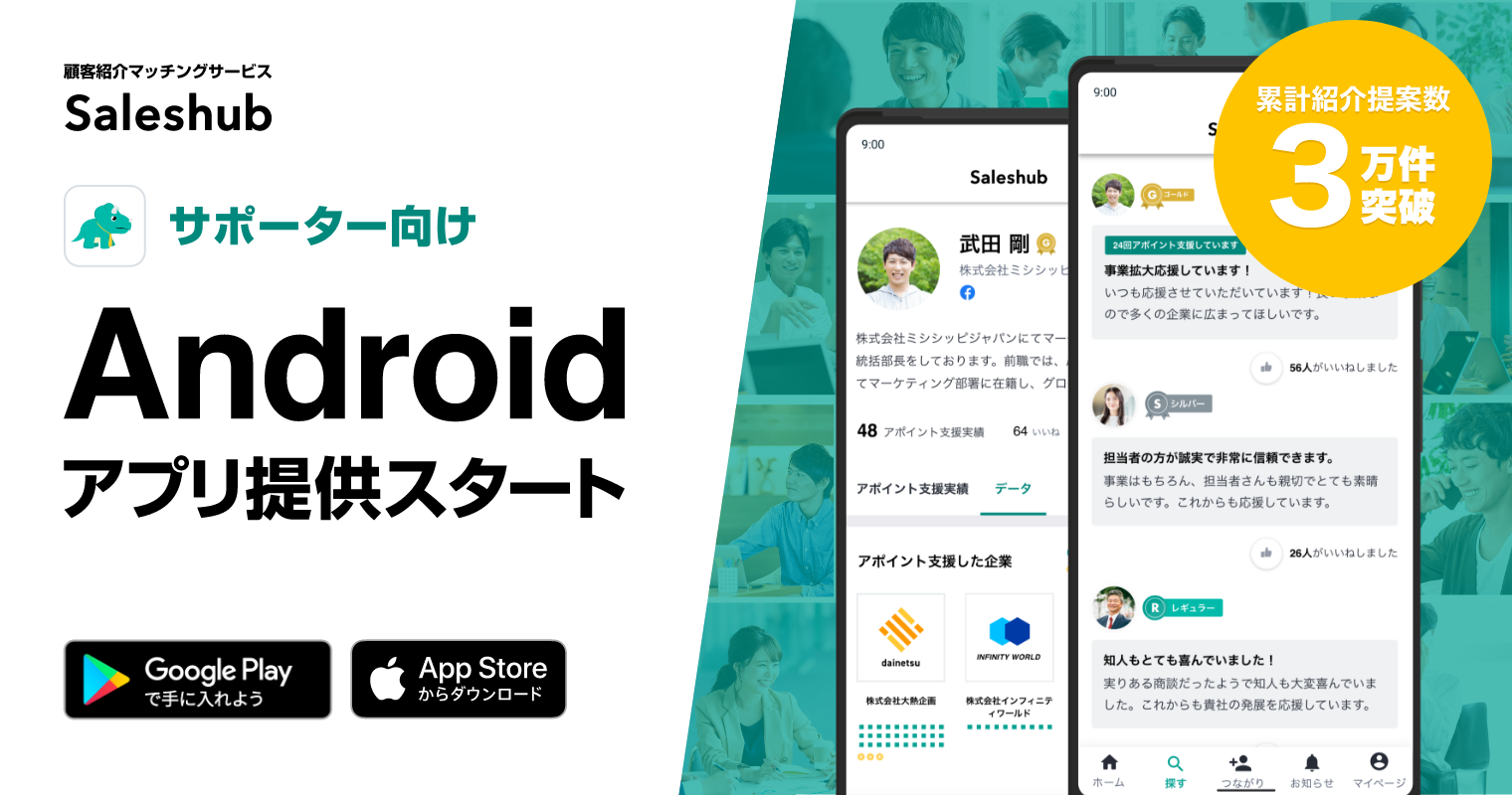 Saleshubは営業職などのビジネスパーソンが「サポーター」として企業向けに顧客候補の紹介支援を行う、顧客紹介マッチングサービスです。2017年6月のサービス開始からこれまでに、累計30,000人以上がサポーター登録し、企業への紹介提案数は累計約3万件にのぼります。
