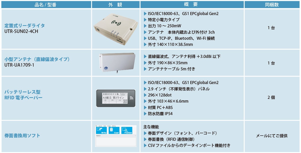 | セット内容 | ① UHF帯RFIDリーダライタ『UTR-SUN02-4CH』×1台 ② UHF帯RFIDアンテナ『UTR-UA1709-1』×1台 ③ バッテリーレス型電子ペーパー×2個 ④ 表示書換ソフト×1式 ※ご購入後にメールで配布 |