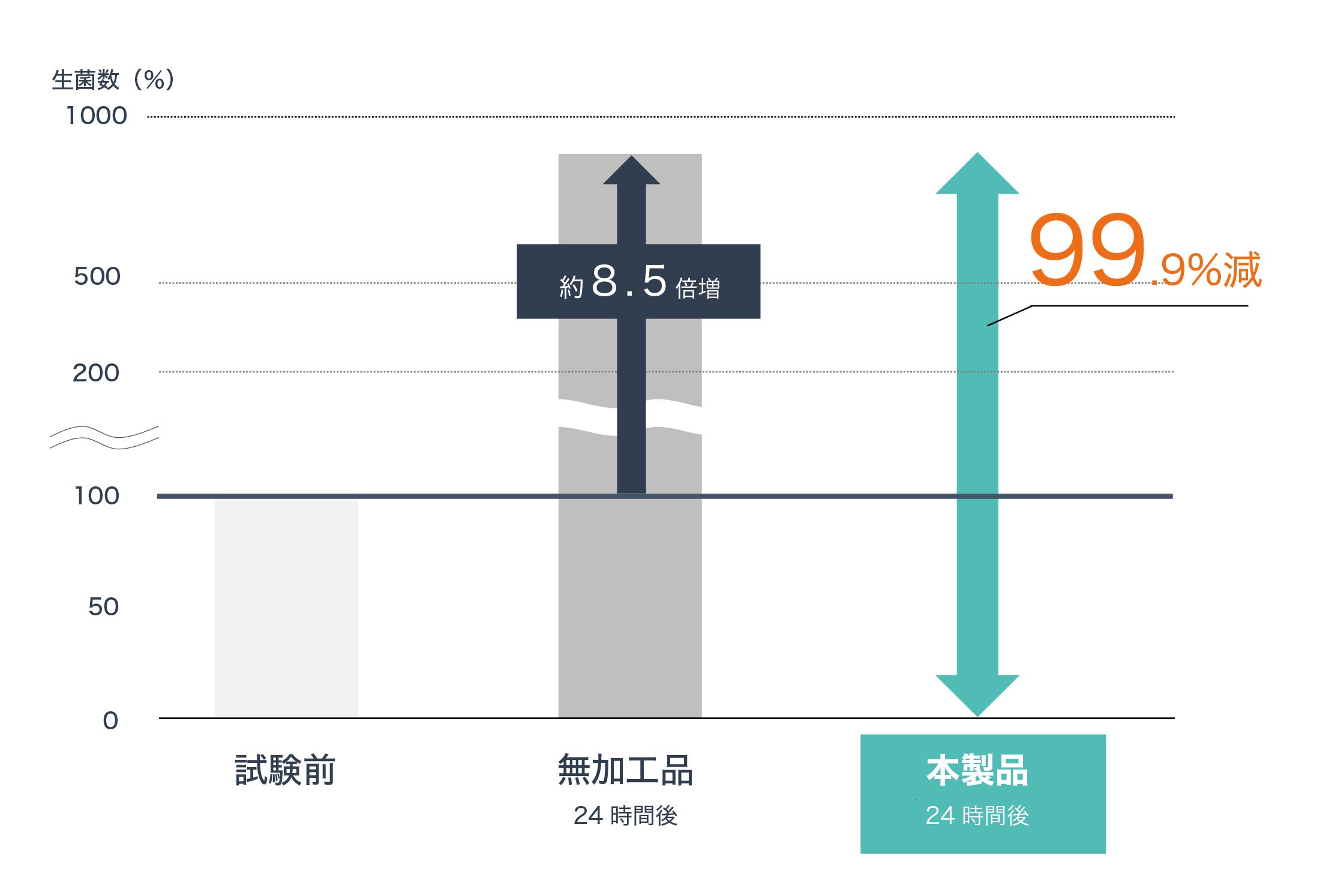 抗菌効果測定実験※1では、従来の無加工品と比較して、本製品では24時間後に細菌が99%以上減少していることが確認されています。