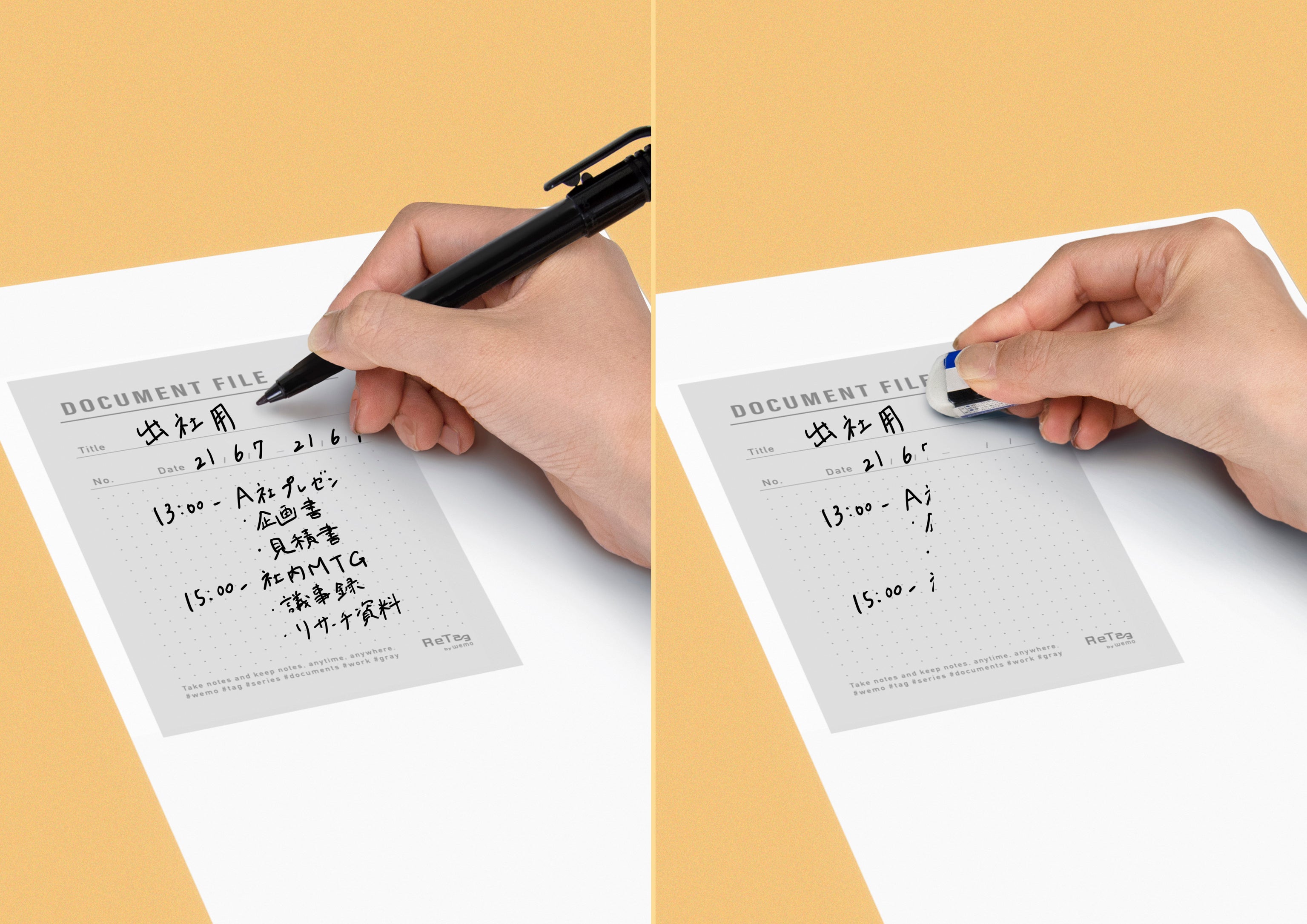 wemoシリーズは累計85万個を突破している大ヒットシリーズです。バンドタイプの他にもパッドタイプ・ケースタイプ・IDカードホルダーの4種をご用意、目的やTPOに合わせて選ぶことができます。2021年3月には、油性マーカーで書いて消しゴムで消せるポリカーボネート製の「wemo#tag」シリーズを発売しました。さらに、2021年8月に、使い捨てることが前提であったクリアファイルの常識を覆し、油性マーカーで繰り返し書いて消せるドキュメント収納アイテム「ReTag by wemo」を発売しました。「脱・使い捨て」のサステナブルかつ便利なアイテムです。2022年7月にはWEB会議でのコミュニケーションロスを解消するビジュアル筆談ツール「wemo paper flip board」を発売。2022年度文具大賞 デザイン部門 グランプリを受賞しました。