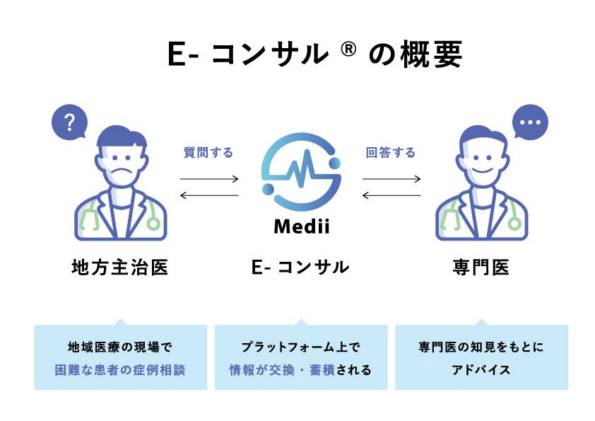 Mediiが提供する『E-コンサル®』は、地域に分散している特定領域の専門知見を有する専門医と、専門医からアドバイスを受けたい医師をオンラインで繋げ、無料で症例相談ができるサービスです。質問医が自身だけで解決困難な症例の内容を投稿すると、システムが選定した最適な回答医(専門医)に通知が送られます。その中で、最も早く相談対応ができる専門医とマッチングされ、1対1でのコンサルが受けられます。