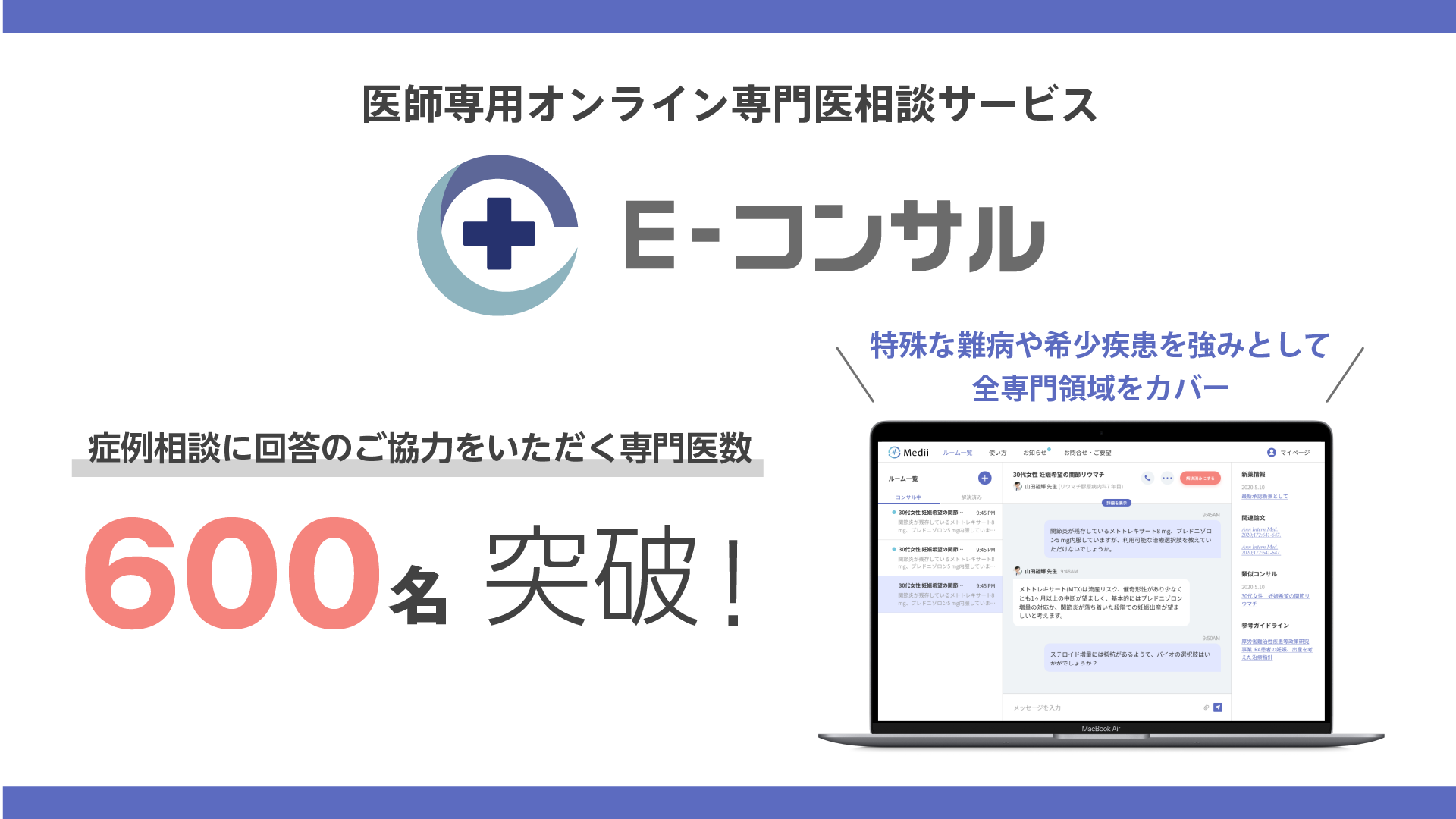 この度『E-コンサル®』では、相談に回答協力をする専門医の登録数が600名を突破し、全ての専門領域における医療相談が可能になりました。限りのある専門医の知見を、必要とする地域へ届ける『E-コンサル®』によって、専門医偏在問題を解消し、どの地域にいても専門的な医療が受けられる社会の実現を目指してまいります。