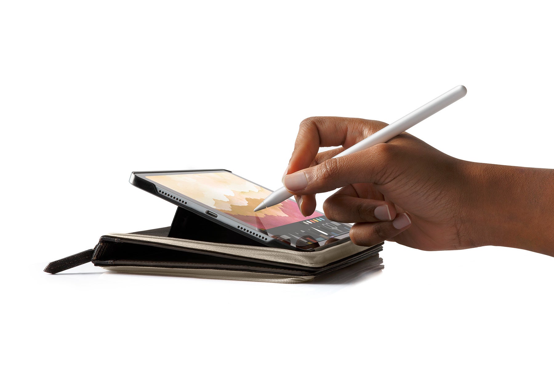 - Apple Pencilを装着しても、しっかりフィット。外出先や移動中でも充電できます。