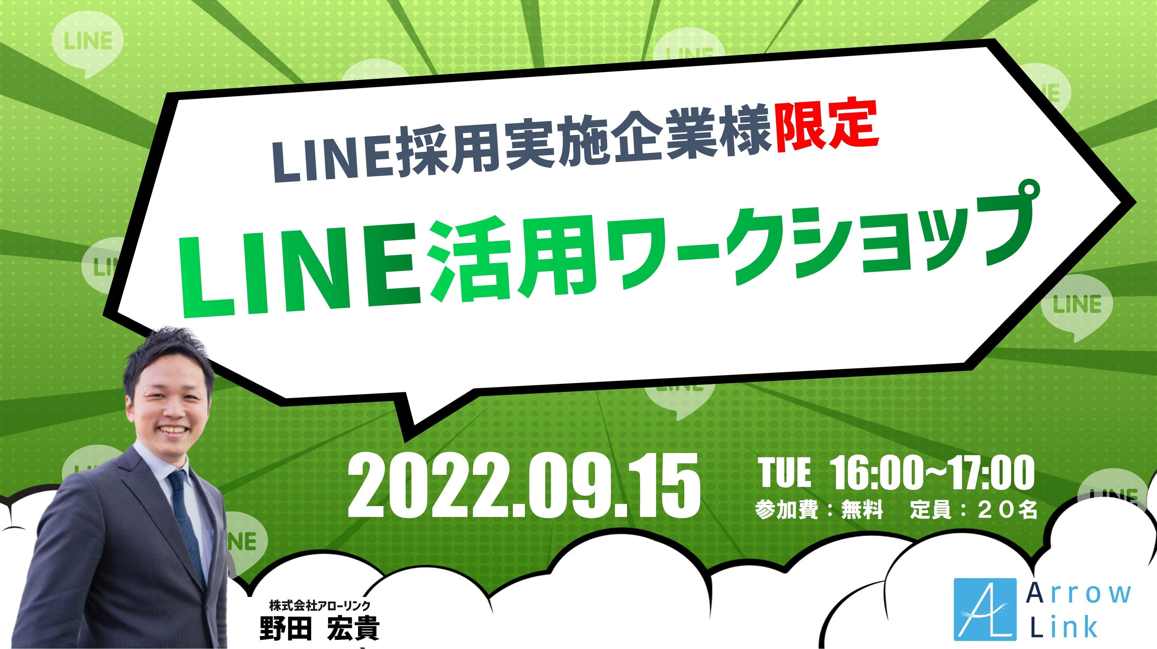 株式会社アローリンク(本社:兵庫県神戸市、代表取締役:蓬莱和真)は、9/15(木)にLINE採用実施企業様限定のLINE活用ワークショップを無料で開催します。今の学生に合わせた”LINE活用方法”について詳しくお伝えします。