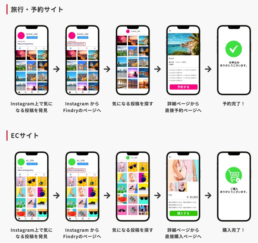 ユーザーがInstagram上で気になる投稿を発見し、該当アカウントのプロフィールからFindryのページにアクセスしてもらいます。そこで気になる投稿をクリックしてもらうと、該当投稿に関連する商品やサービスのページに到達し、購買行動を起こしてもらいます。