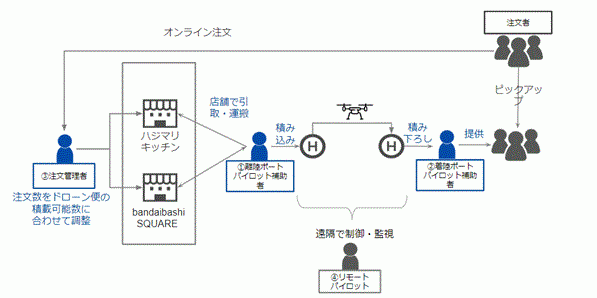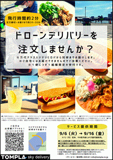 しかし、 これまでの実証事業は、 運搬後の食品品質や航路の検証のため、 単日かつ限定された注文回数での実施となり、 実際の市場環境とは言い難いものでした。そこで、ドローンフードデリバリーの商用化のため、 10日間のテストマーケティングを実施し、商用ドローンの普及を加速させます。