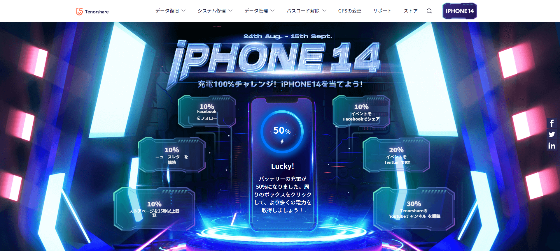 株式会社Tenorshareは、iPhone 14応援キャンペーンを期間限定で開催いたします。iPhone 14/Amazon ギフトカード/20%OFFクーポンが当たる!