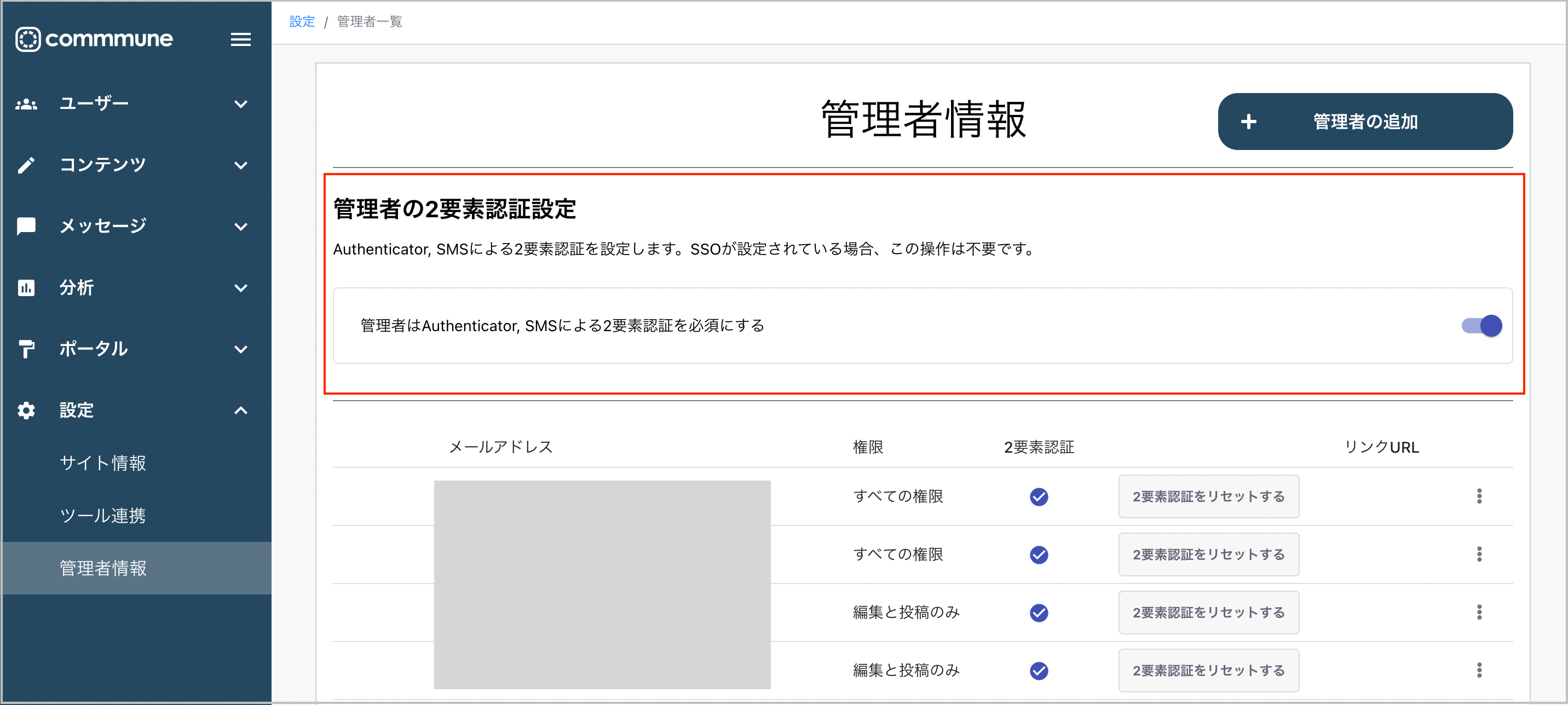 管理者ユーザーがアカウントへログインする際の二要素認証が管理画面より設定可能です。セキュリティが強化され、より安心してユーザー情報をお取り扱い頂けます。認証方式はSMS形式とAuthenticator形式をそれぞれ選択可能です。