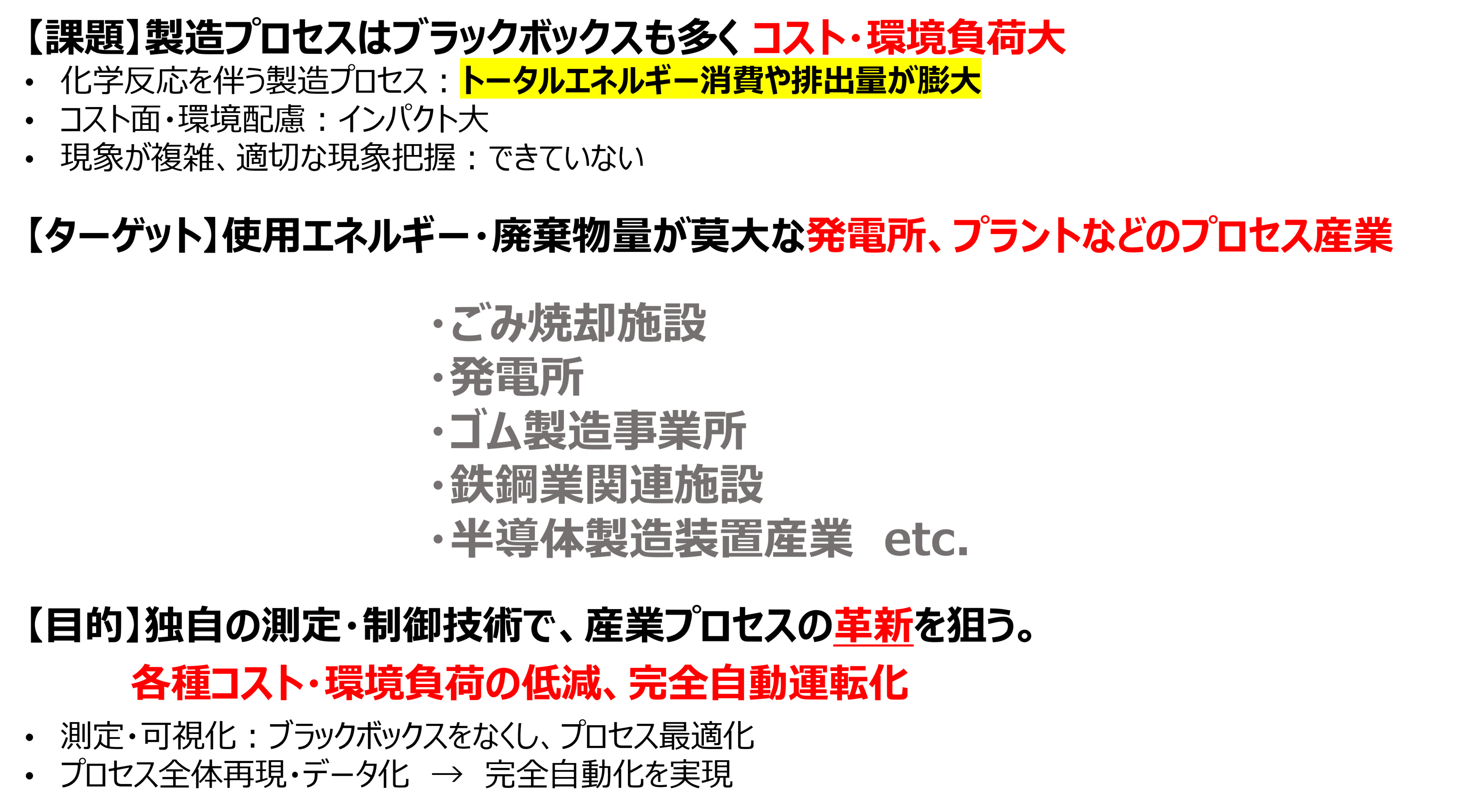 化学プラントや製鉄プロセス、燃焼炉などは、素材産業や発電をはじめとした現代社会を支える基幹産業の要となるテクノロジーです。しかし、「高温・高圧といった過酷な環境」、「複雑で多段階にわたる反応」、「プロセスの中断不可」などの制約のため、工程に多くのブラックボックスがありました。そのため、エネルギーや原料の効率を最大限に高めるような制御も難しい状況でした(安全率を高めにとる‘鈍った制御‘を行わざるをえない)。
