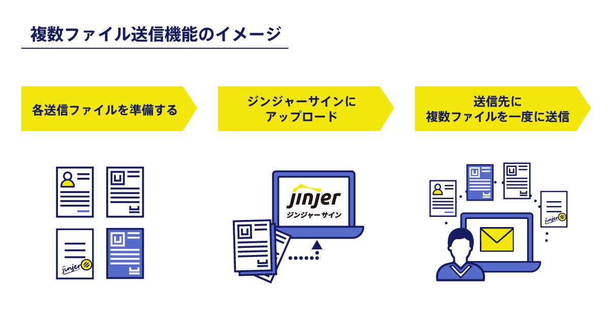 「ジンジャーサイン」では、これまで契約相手に複数の契約書類を締結する必要がある際は、契約書ごとに書類を送信する、もしくは契約書のファイルを結合する必要がありました。今回の複数ファイル送信機能の実装により、複数の契約書を1回の送信で完結することができ、業務工数の削減につながります。