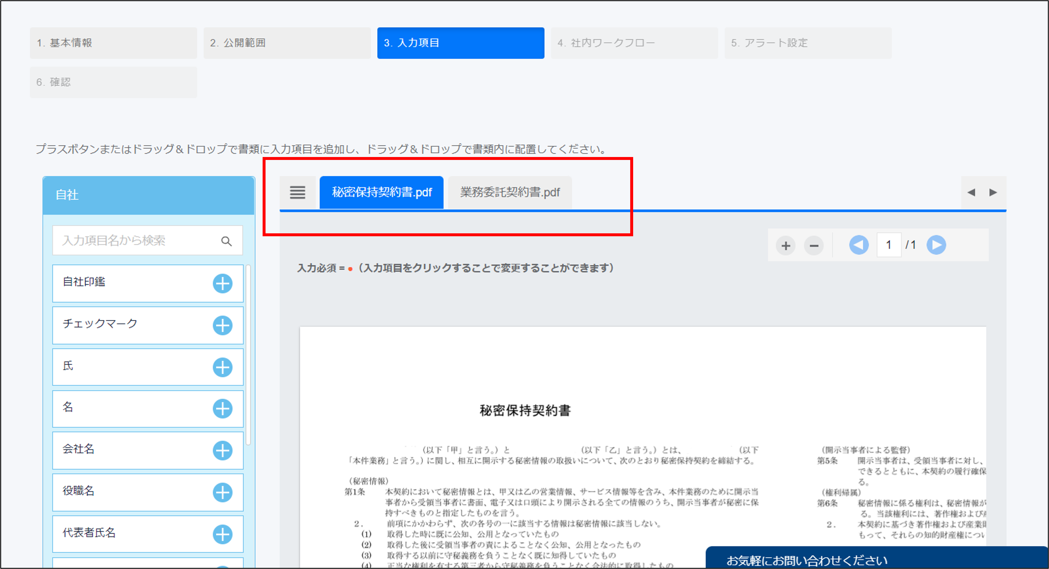 テンプレート設定画面で複数のファイルがアップロードでき、ファイルごとに必要な入力項目を設定可能です。