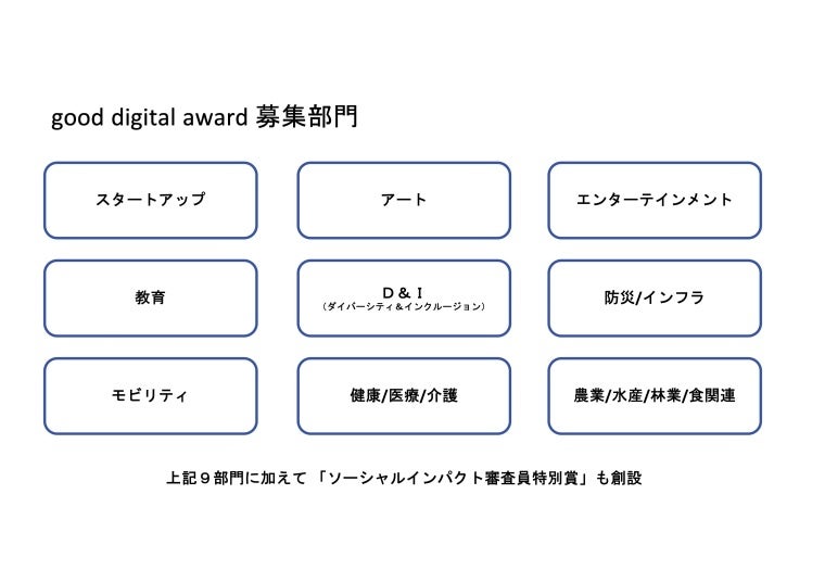 デジタル庁が、同庁のミッションである「誰一人取り残されない、人に優しいデジタル化」に貢献している、又は今後貢献し得る個人や企業・団体を「スタートアップ」「アート」「エンターテインメント」「教育」「D&I(ダイバーシティ&インクルージョン)」「防災/インフラ」「モビリティ」「健康/医療/介護」「農業/水産/林業/食関連」の全9部門から表彰するものです。