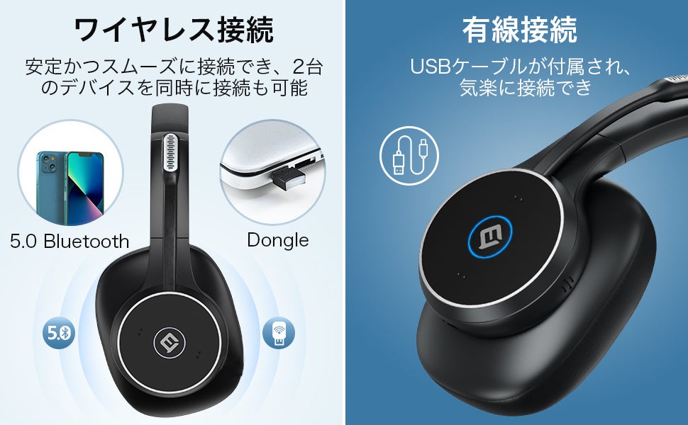 EMEETヘッドセット HS150は、USB接続がもちろん、Bluetooth5.0とドングルで安定的で快適なワイヤレス接続ができ、PC、デスクトップ、タブレット、携帯電話など様々なデバイスで利用可能である。