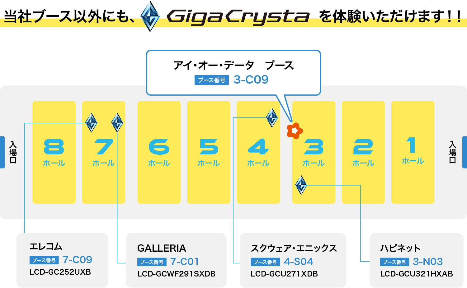 当社ブース以外でも、実はゲーミングモニター「GigaCrysta」を試遊できるコーナーがたくさん!特長が異なるモニターがそれぞれ展示されておりますので、サイズ感や使用感を実際にお試しいただけます!