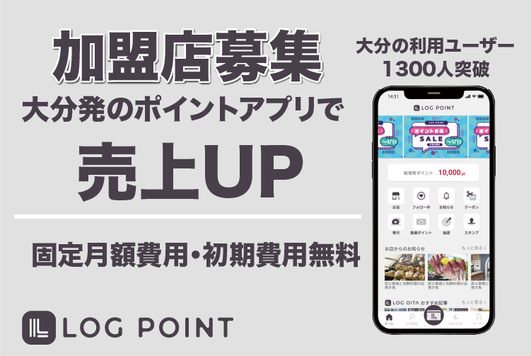 飲食店の情報や観光情報を日々発信しておりますが、新型コロナウイルス感染症で外出を控え、飲食、観光業界は大きな損失をもたらした現状を受け、再び大分の活性化を図る目的として地域特化型のポイントアプリ『LOG POINT』を2022年5月26日に正式リリースする運びとなりました。