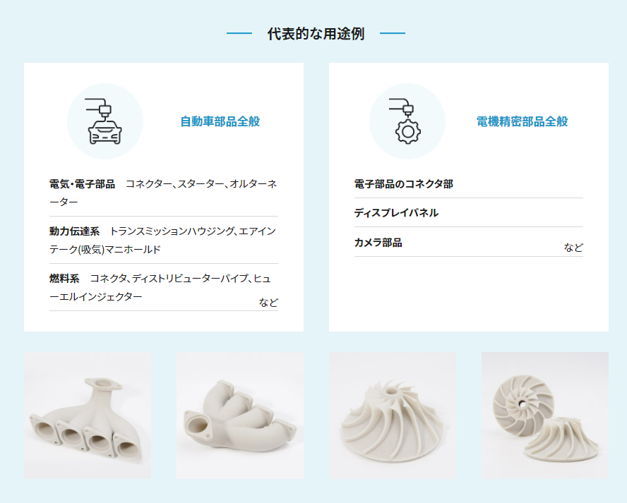 ガラス入りナイロンは、高い強度と耐熱性が特徴で、高熱・高荷重下での耐久性が求められる部品の構造や機能評価試作、最終製品用途にオススメの素材です。一般的には、自動車部品や電機精密部品全般で活用されています。