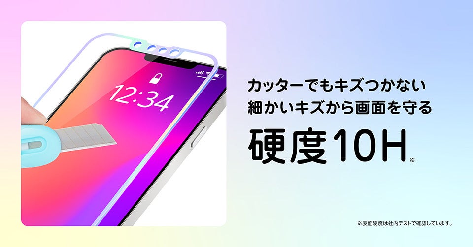表面硬度10Hで液晶割れを徹底ガード。擦りキズに強く、カッターでもキズが付かない超硬度のガラスフィルム。