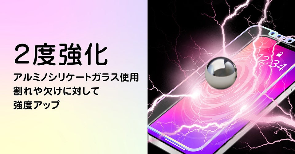 アルミノシリケートガラスを使用し、ガラスコーティングを2度にわたって強化いたしました。割れや欠けに強いサンクレスト独自の強化ガラスフィルム。