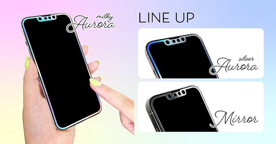 そういった”韓国ブーム”に注目した株式会社サンクレストは、36年間培ってきた技術を元に、ガラスフィルムのフレームカラーを「黒」から「オーロラ」と「ミラー」へ変更。フレームがワンポイントに目立つオシャレで華やかなスマートフォンへ変身します。