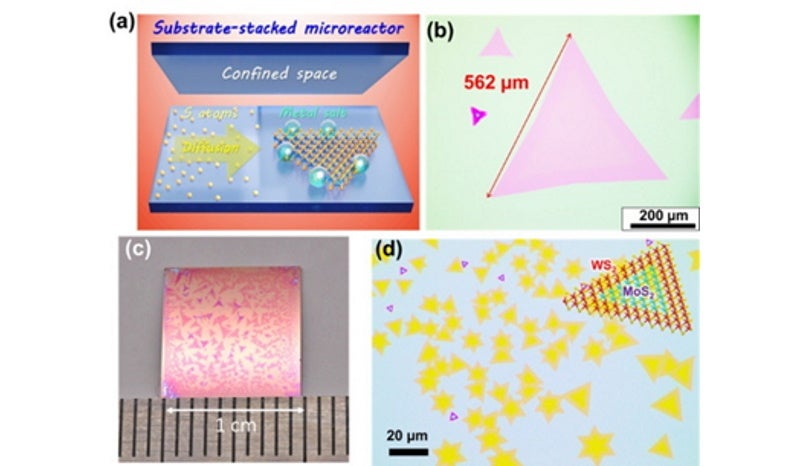 (a) マイクロリアクタ内部でのTMDC成長の模式図