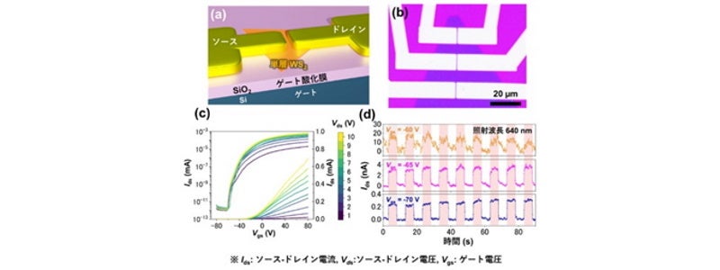 (a,b) 単層WS2をチャネルに用いたFETデバイスの (a) 模式図と(b) 光学顕微鏡写真