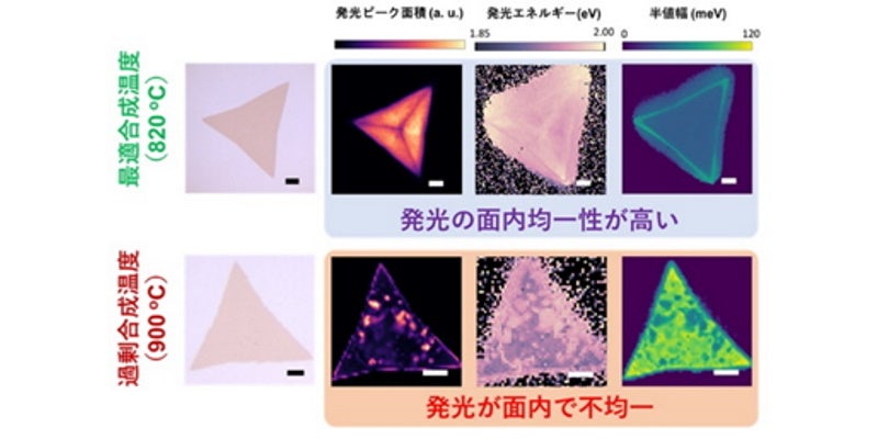 異なる合成温度(上段: 820℃、下段: 900℃)で合成したWS2の顕微鏡写真と発光特性マッピング。左から発光ピーク面積、発光エネルギー、半値幅