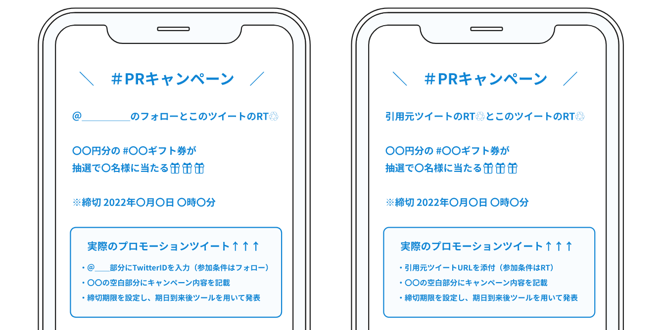 Twitter上で特定のアカウントのフォローや特定のツイートのリツイート、特定のハッシュタグをつけたツイートすることなどの条件を付与し、その条件を満たしている参加者様に対して、商品やギフト券などの景品が贈られるといった内容のマーケティング手法です。