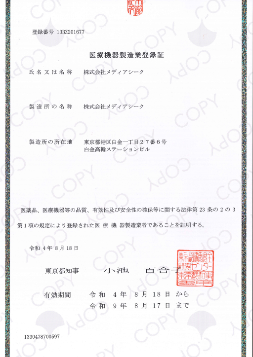 株式会社メディアシーク(本社:東京都港区、代表:西尾直紀、以下「メディアシーク」)は、2022年8月18日付で、「医療機器製造業」として登録されました。登録が完了したことにより、医療機器プログラム(治療用アプリ ※1)の開発・設計・製造といったサービスの提供が可能になります。