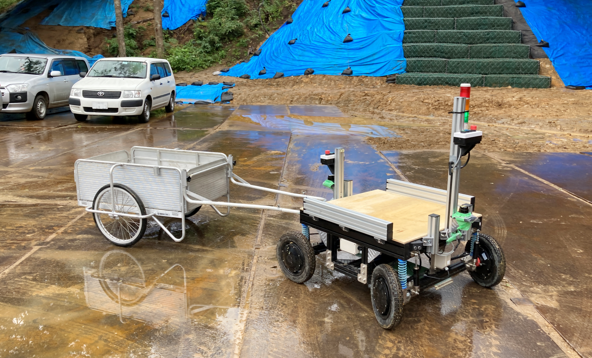 2日目は、北海道北広島市にあるボールパークへのアクセス道路の施工現場にてデモ走行を実施。実際に現場で使用しているリヤカーを現地部品で連結し、資材運搬作業の自動化を試みました。