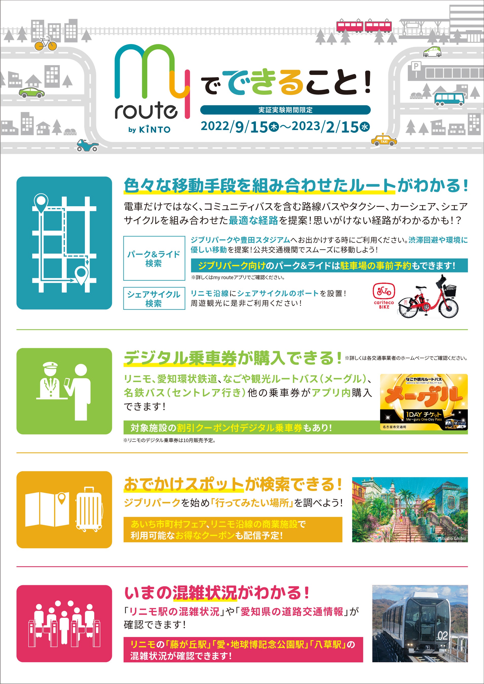 トヨタファイナンシャルサービス株式会社(本社:愛知県名古屋市、代表取締役社長:頃末広義、以下、TFS)は、昨年に続いて愛知県様が実施する「マルチモーダルサービス導入実証事業」を受託し、トヨタファイナンス株式会社(本社:愛知県名古屋市、代表取締役社長:西 利之、以下、TFC)と共同して、名古屋東部丘陵地域を中心にTFSが全国展開するスマートフォン向けマルチモーダルモビリティサービスアプリ「my route(マイルート)」を活用した実証実験を9月15日より開始します。