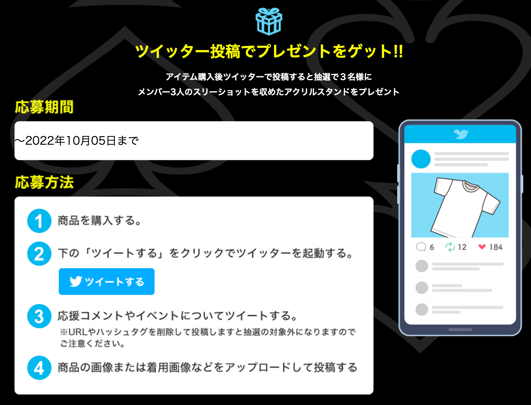 オリジナルのアイテムを作成して写真付きでツイッターより指定のハッシュタグとURLをつけて投稿すると、抽選で3名様にメンバー3人のスリーショットを収めたアクリルスタンドをお届けいたします。ぜひ奮ってご参加ください!