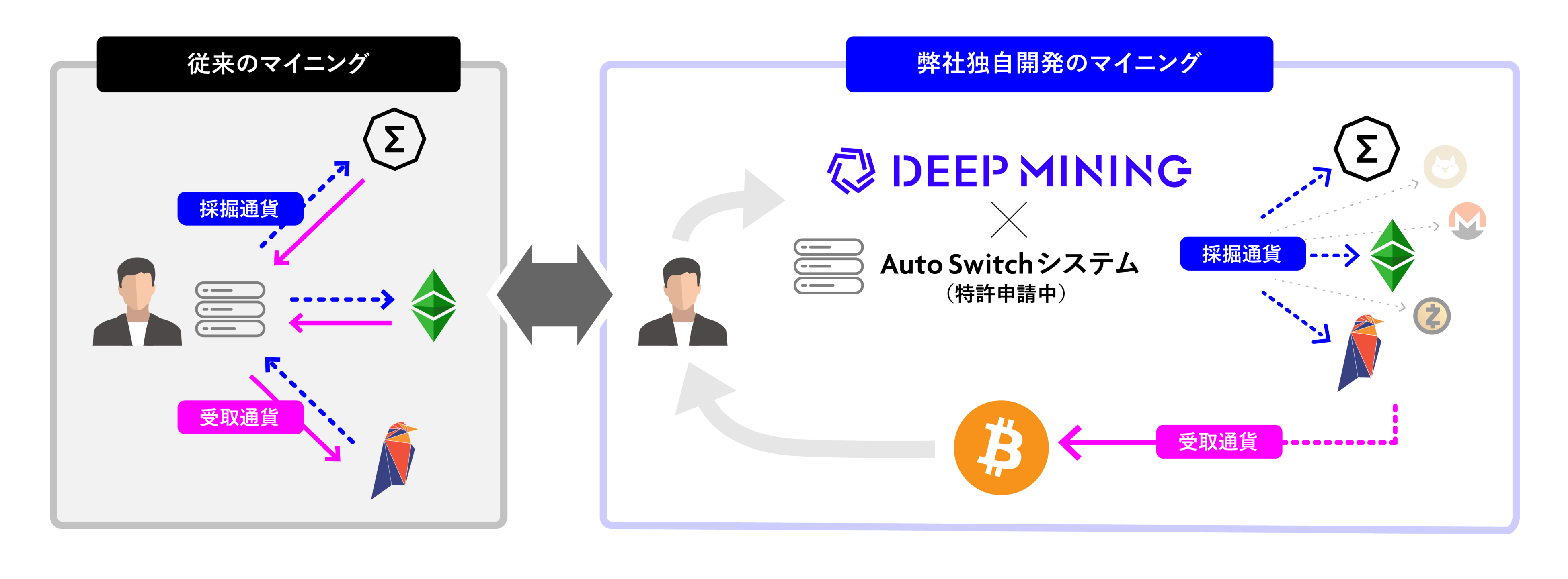しかし、当社の独自技術である「Auto Switchシステム(特許申請中)」とDEEP MININGとの連携により、複数の通貨から収益性の高い通貨を自動で選定しマイニングを行います。PoS移行後も安定した採掘量の維持だけでなく、高い収益性を実現します。