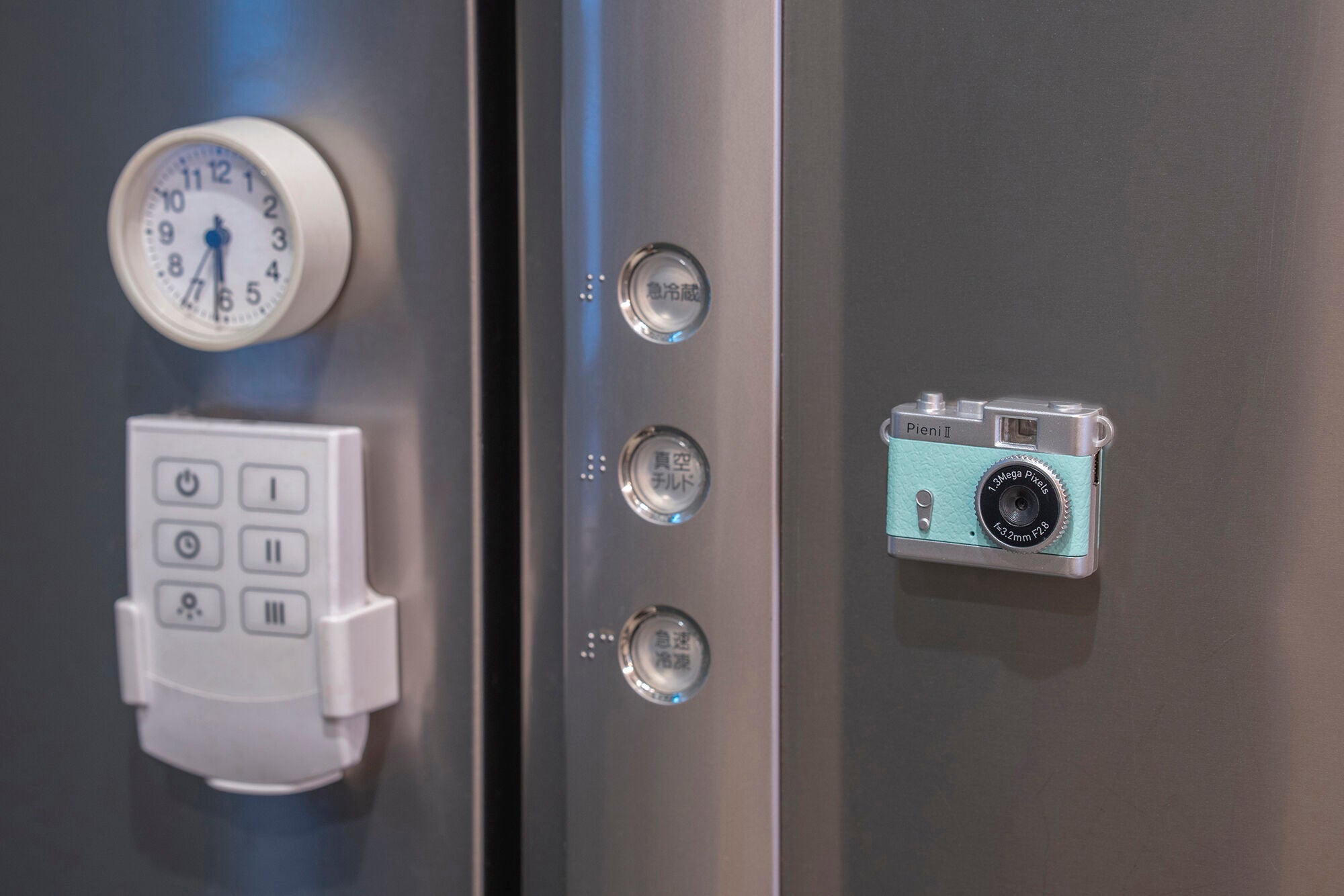 カメラ背面にマグネットを内蔵。冷蔵庫など磁石がくっつくところにピタッと固定できて動画撮影時に便利です。
