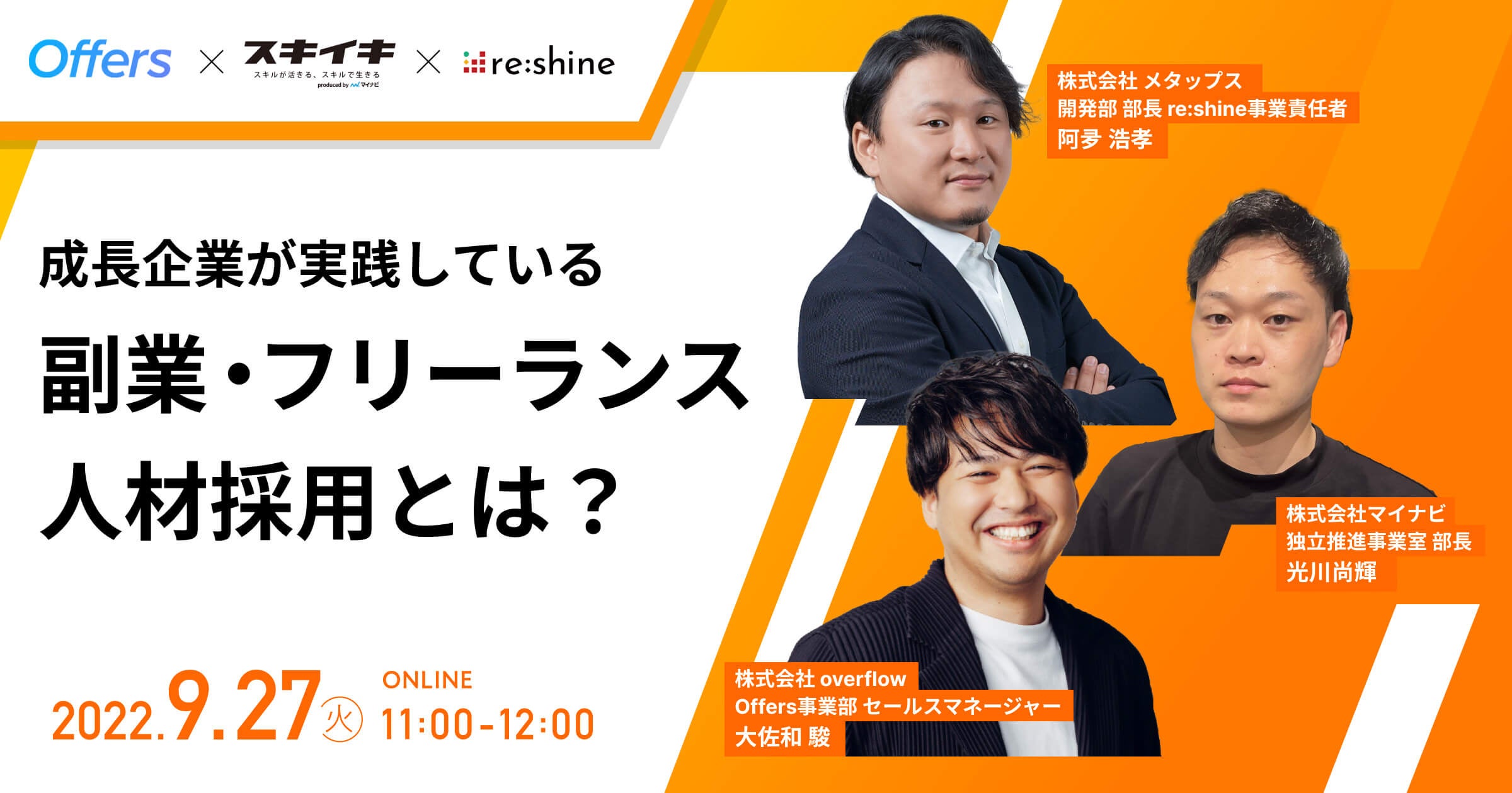 本セミナーでは、副業・フリーランス人材の採用サービスを提供する3社が、組織を成長させる上でどのように副業・フリーランス人材を考えるべきか、他社の成功事例を通じて、明日から活用できる採用ノウハウをお届けいたします。